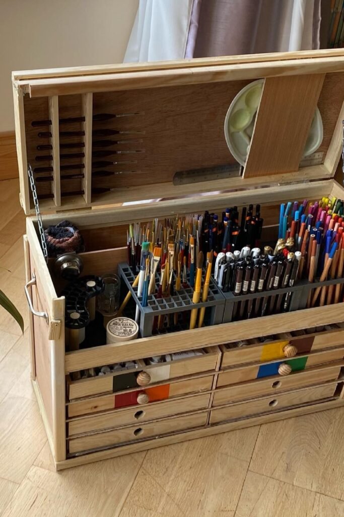 A practical upgrade for creatives is building a multi-drawer wooden chest that keeps brushes, markers, and tools sorted for effortless daily access everywhere.