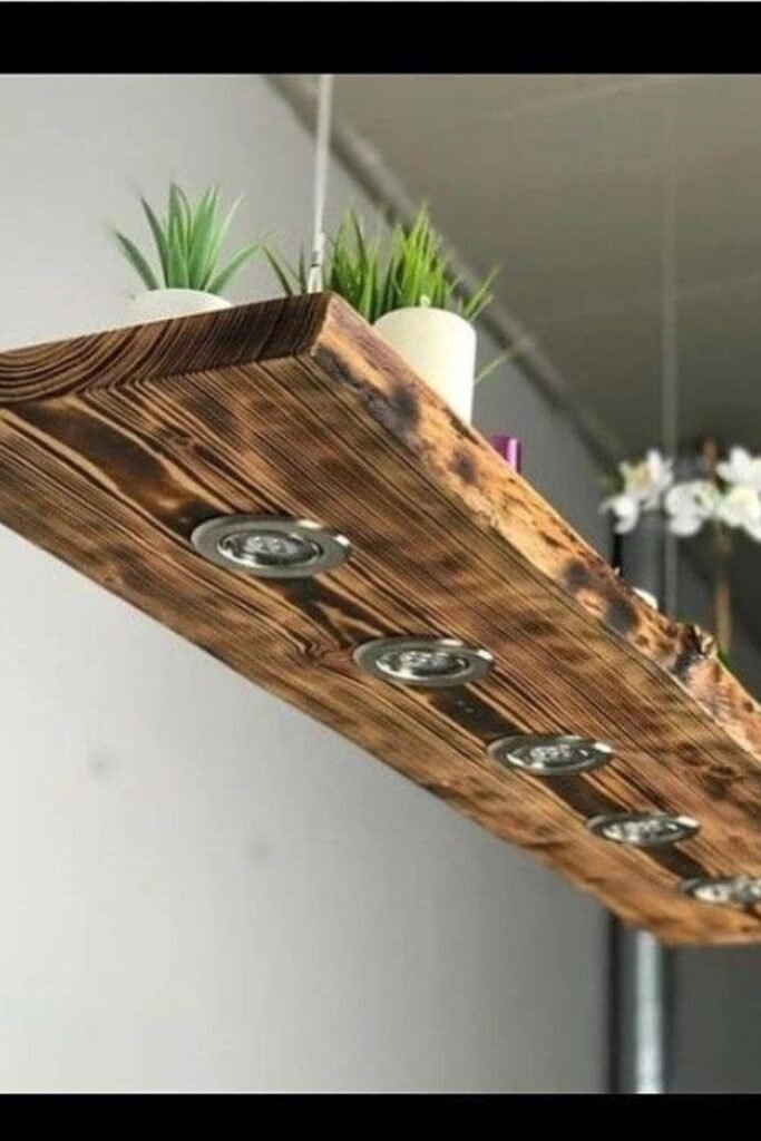 When you want dramatic lighting, burning a thick timber plank lightly and embedding spotlights underneath creates a suspended shelf glowing with rustic charm.