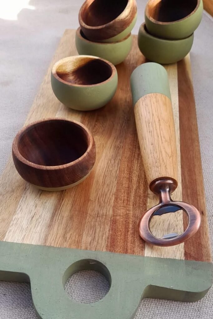 Adding muted color blocks to wooden bowls creates a stylish serving set that instantly upgrades simple snacks with a warm handcrafted touch.
