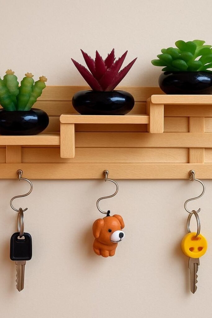 A quick way to organize small essentials is building a stepped key holder shelf that stores mini planters above practical hanging hooks effortlessly.