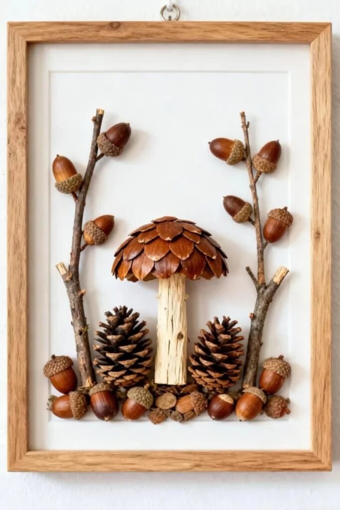 Use fallen branches, pinecones, and acorns to build a woodland shadow frame that brings warm seasonal texture to any wall space.