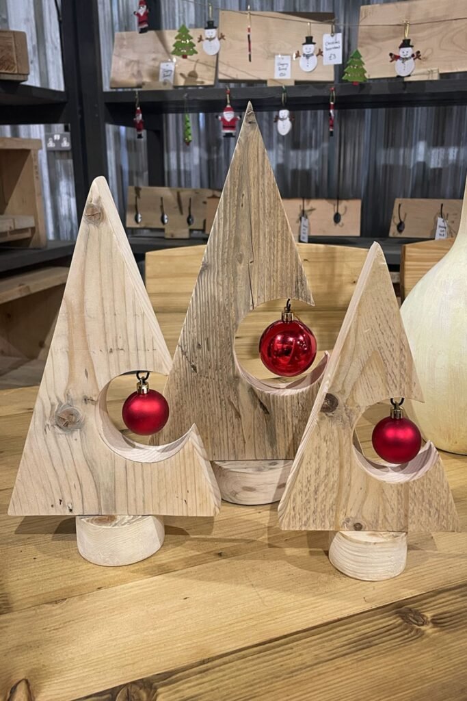 Shape simple triangular trees from reclaimed boards, leaving room to hang ornaments through circular cutouts for quick seasonal accents.