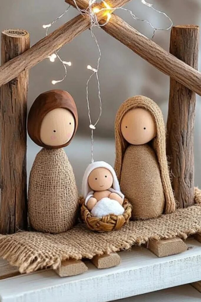 Create a soft nativity display by pairing driftwood posts with fabric-wrapped wooden figures that offer warmth without detailed carving.