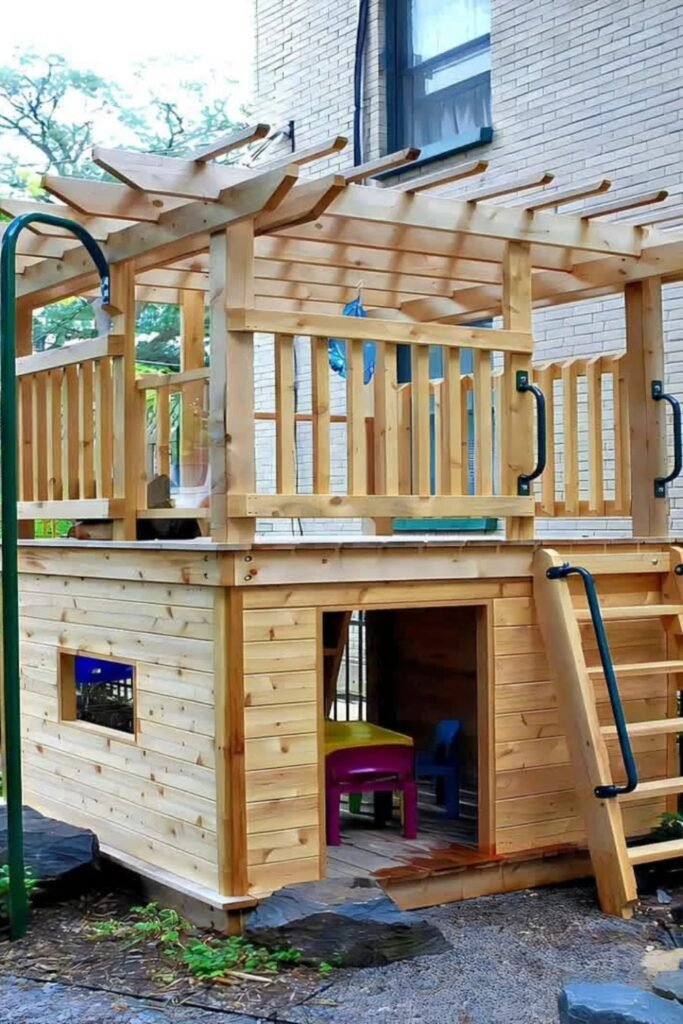 For outdoor fun, constructing a two-level wooden playhouse with rails, ladders, and shade beams creates an engaging space children use daily with excitement.