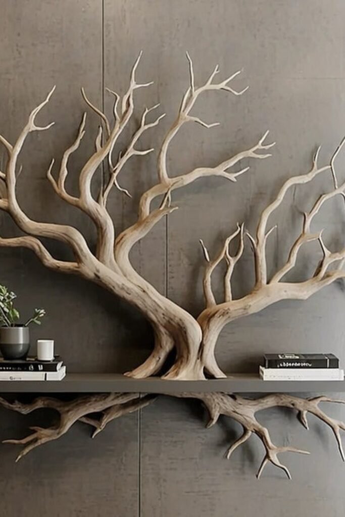 If you want dramatic wall art, shaping branching wooden limbs around a floating shelf creates this nature-inspired centerpiece blending sculpture with functional storage.