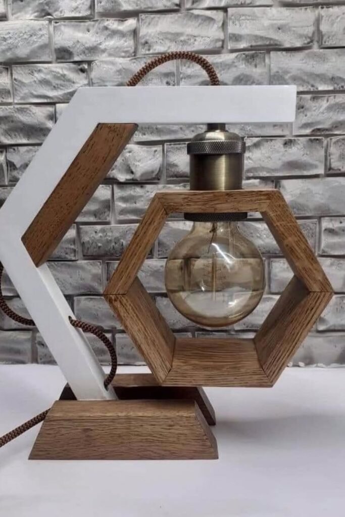 A clever way to elevate a desk corner is building this geometric lamp shape using angled wood cuts forming a striking modern frame.