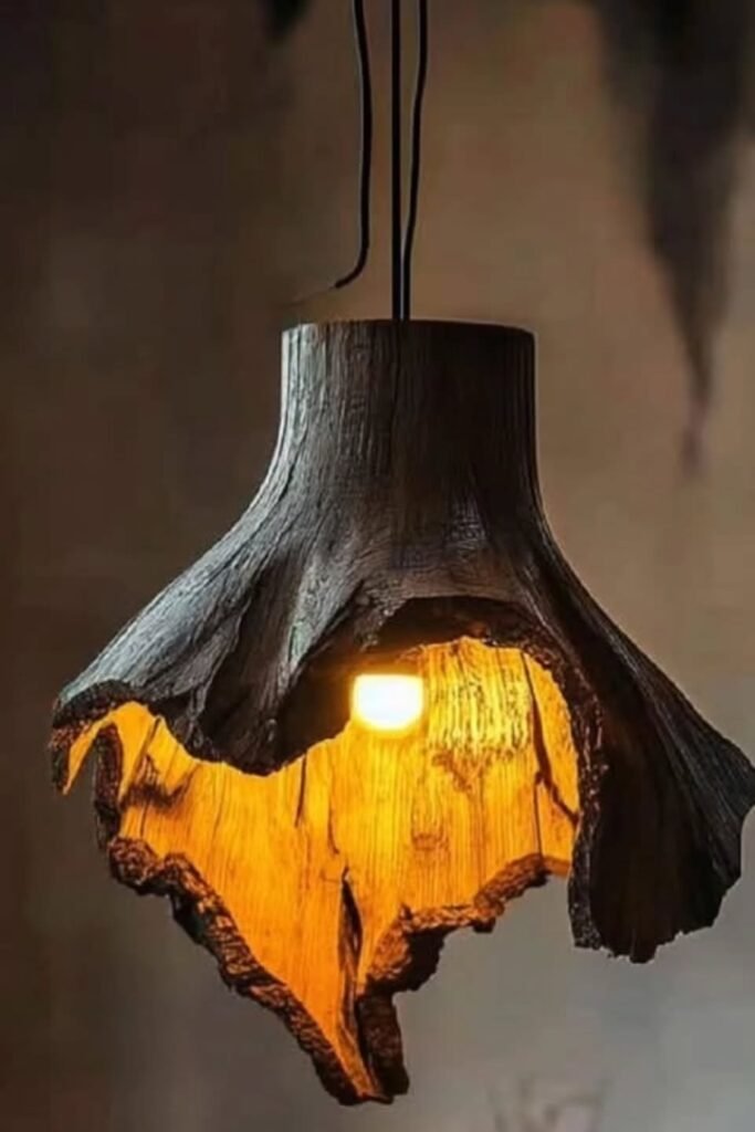 Let nature guide your lighting by carving an uneven hollow inside a thick trunk section, allowing warm bulbs to glow through textured edges.