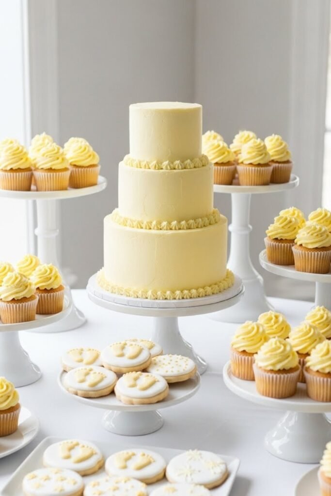 Style a dessert table using soft buttercream yellow tones instead of bold shades. Use cupcakes, cookies, and a small cake displayed on neutral stands.