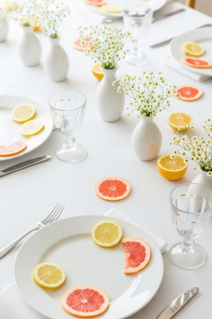 Use thin lemon slice cutouts or faux citrus pieces as table accents. Scatter them lightly around place settings or centerpiece bases.