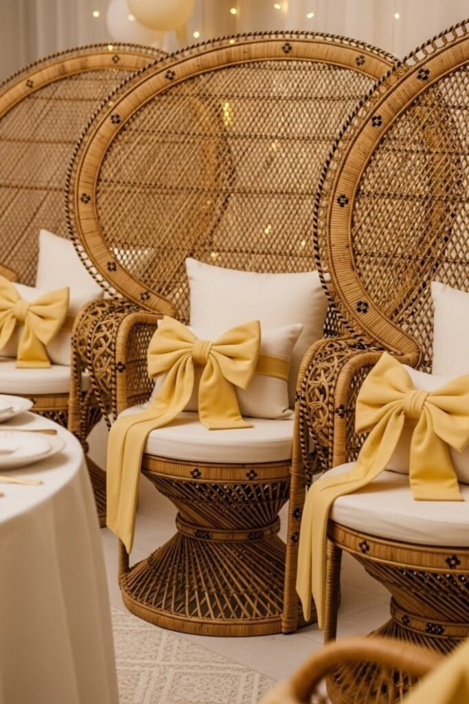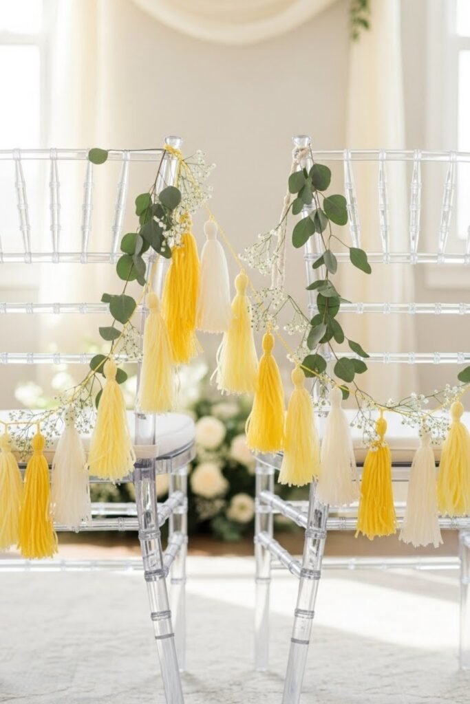 Add yellow tassel garlands to the backs of chairs, especially around the gift or dessert area. Keep the tassels light and spaced out so they don’t overwhelm the seating.