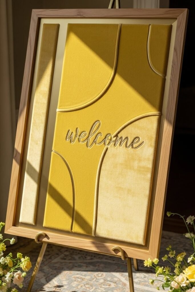 Use a soft yellow velvet fabric as the base for a welcome or baby-name sign. Mount it on a wooden or gold frame for a luxe look.