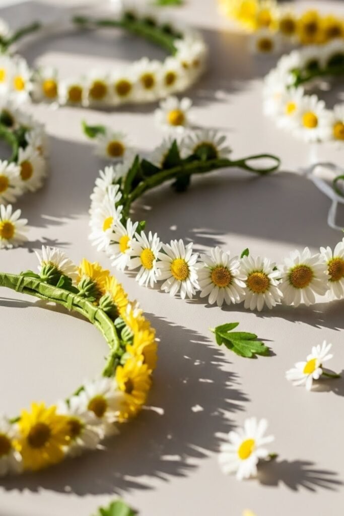 Offer simple daisy crowns for guests to wear during the shower or photo time. Use soft yellow and white faux flowers to keep them lightweight and comfortable.