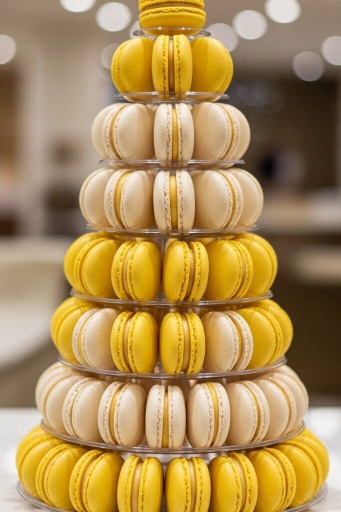 Create a tiered macaron display using yellow, cream, and white flavors. Arrange them on clear or white stands so the colors stay soft and balanced.