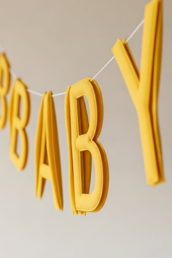 Hang a personalized baby-name banner using yellow fabric, paper, or acrylic letters. Keep the design simple to avoid overwhelming the space.