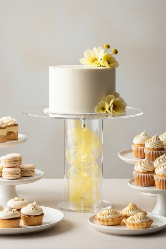 Display the main cake or desserts on a clear acrylic stand with subtle yellow details underneath. The transparency keeps the table light and modern while letting the yellow accents shine.