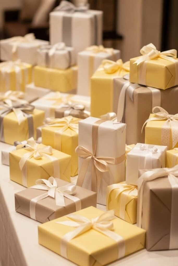 Ask guests to bring gifts wrapped in yellow, white, or neutral paper. Provide extra wrap and ribbon at the venue for consistency.