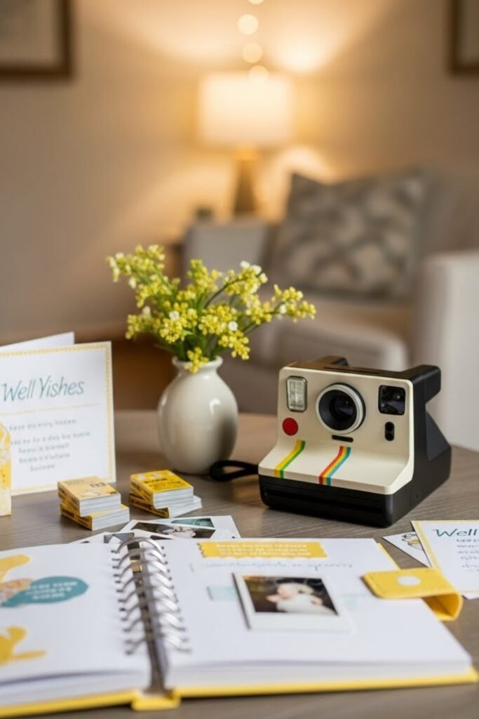 Set up a small station with a Polaroid camera and a yellow-themed guest book. Guests take a photo and add a short note beside it.