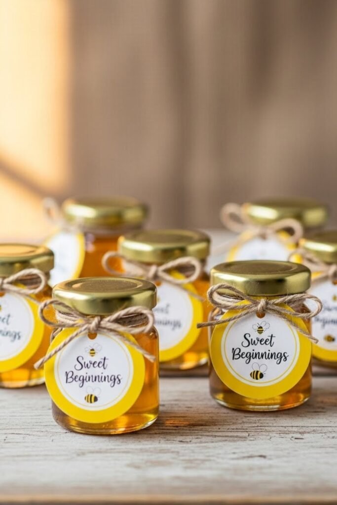 Offer mini honey jars as favors, styled with yellow tags or simple twine. Place them on a dedicated table so guests can pick one before leaving.