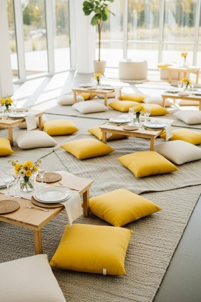 Create a cozy floor picnic area using yellow cushions, low tables, and neutral rugs. This works well for relaxed or outdoor baby showers.