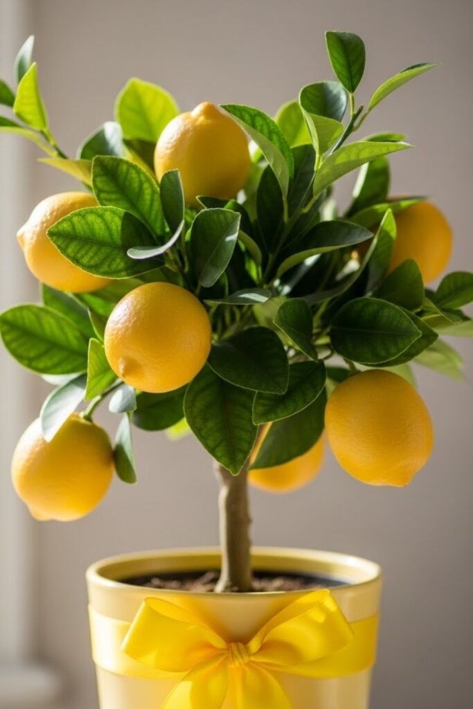 Use a small potted lemon tree as a table centerpiece or entrance accent. Decorate the pot with soft yellow ribbon or a neutral wrap.