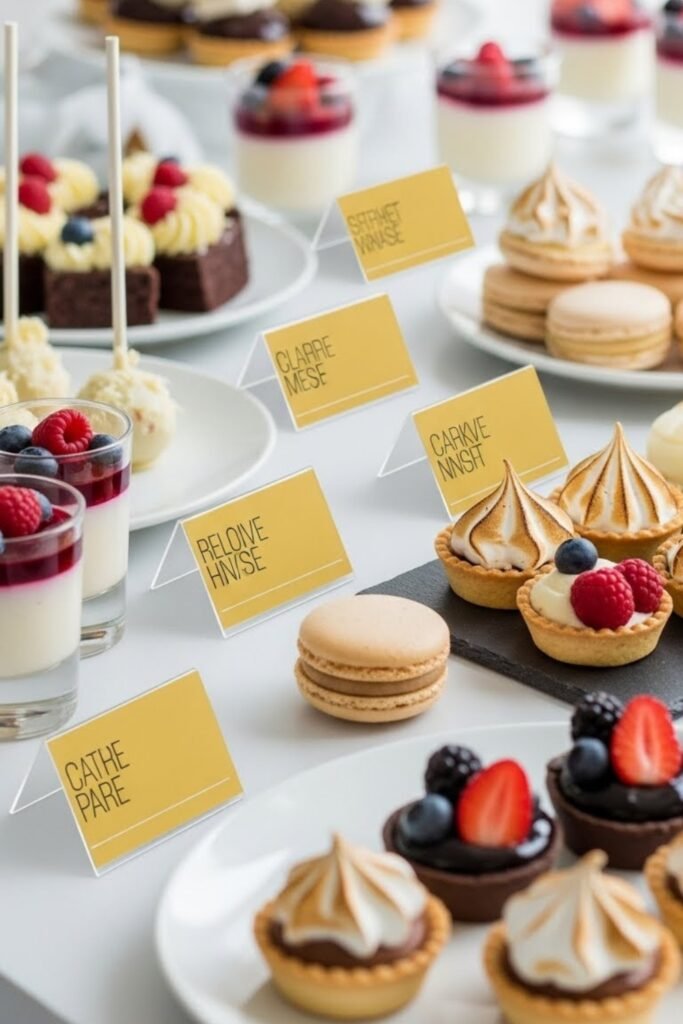Use golden yellow labels to name desserts on the table. Choose clean fonts and simple card holders to keep the look polished.