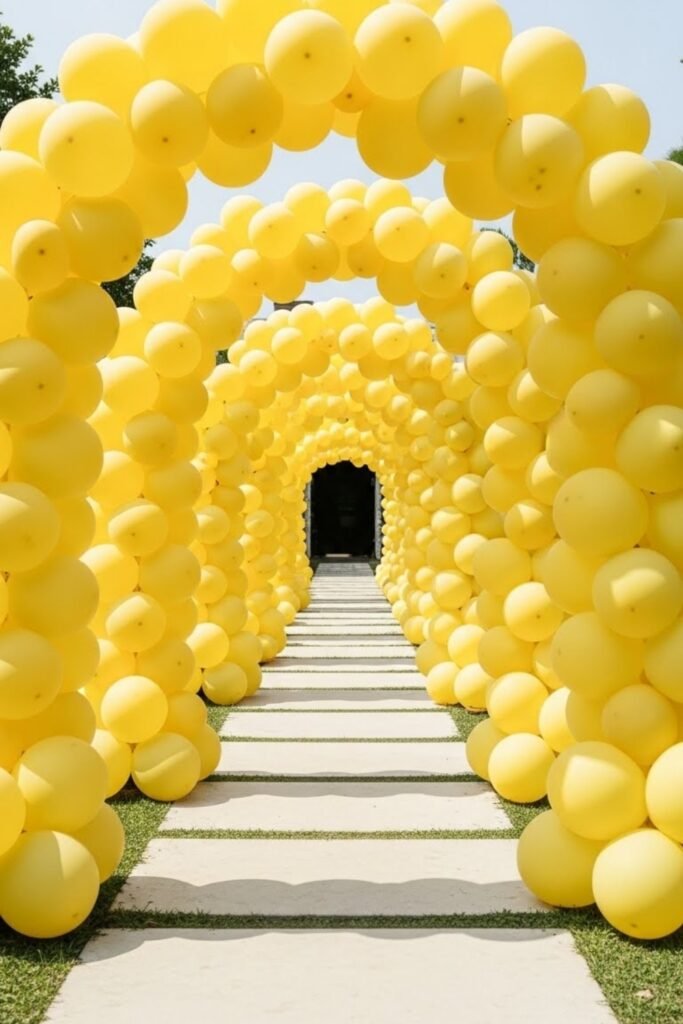 Create a soft yellow balloon pathway leading to the entrance instead of a traditional arch. Keep balloons low and spaced for easy walking.