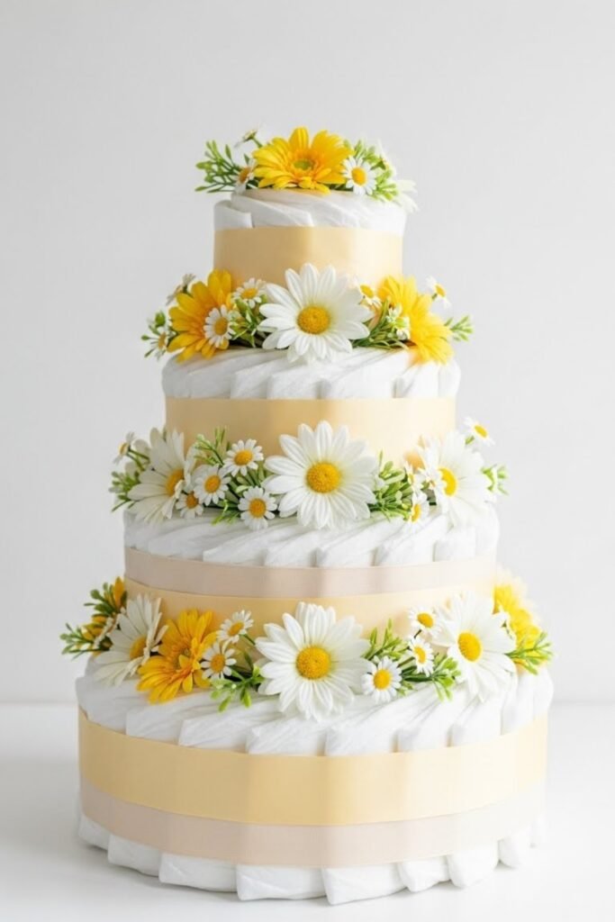 Design a diaper cake decorated with soft yellow daisies instead of ribbons or toys. Tuck faux daisies between diaper layers for a floral, polished look.