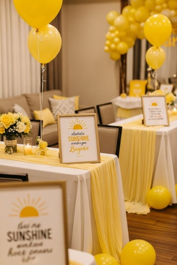 Use uplifting sunshine-themed quotes printed on small signs or cards around the venue. Place them on tables, dessert stands, or near the gift area.