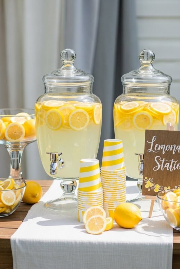 Set up a dedicated lemonade station with clear dispensers filled with classic, strawberry, or mint lemonade. Add yellow-striped cups and simple labels to match the theme.