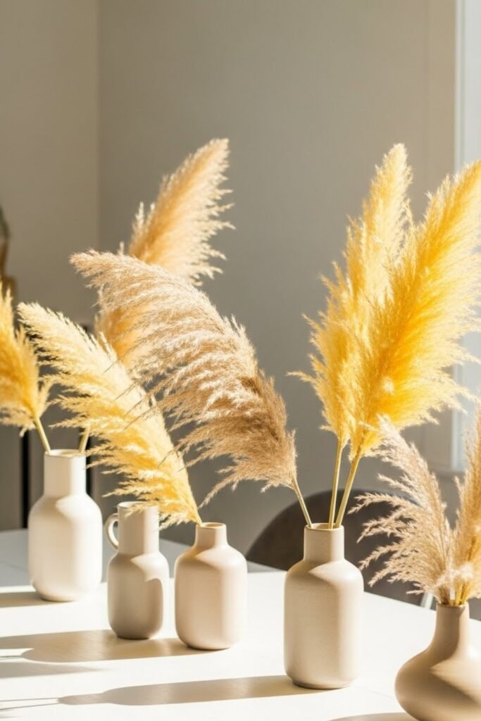 Decorate tables using yellow-toned pampas grass mixed with neutral vases. Keep arrangements airy and tall for a soft, modern look.
