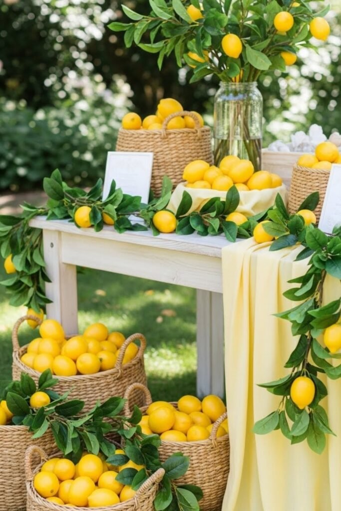 Set up a fresh lemon-inspired welcome table using faux lemon branches, light yellow linen, and white wood accents. Place a simple welcome sign in the center and surround it with baskets or bowls of lemons.