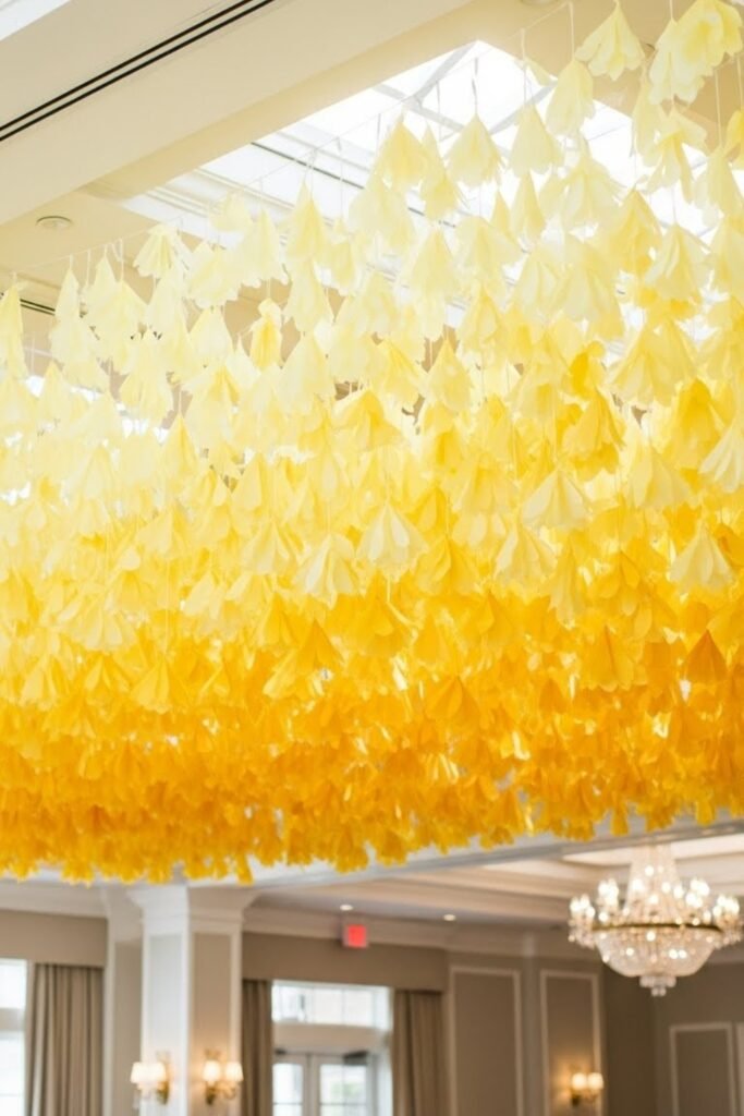 Decorate the ceiling using hanging balloons or paper decor in soft yellow ombre shades, fading from light to deep tones.